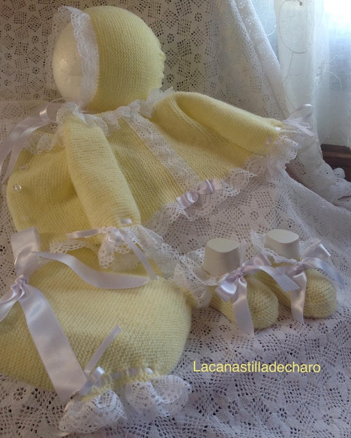 ES UN SENCILLO CONJUNTO DE PRIMERA PUESTA IDEAL PARA LA SALIDA DE NUESTRO BEBE DEL HOSPITAL. CON UN COLOR AMARILLO SUAVE QUE EN ALGUNAS CULTURAS EN SINÓNIMO DE BUENA SUERTE PARA EL BEBE LLEGAR POR PRIMERA VEZ A SU CASA VESTIDO DE AMARILLO.