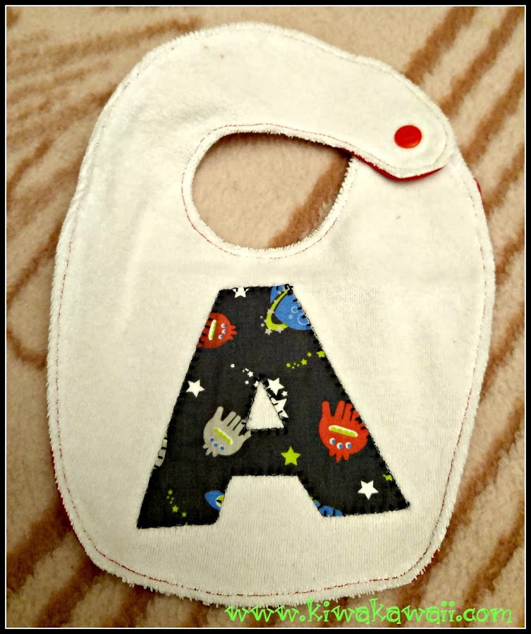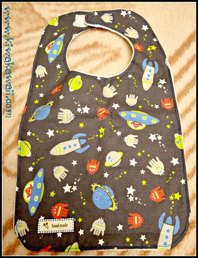 El babero grande es de tela espacial (me encanta esta tela), la parte trasera de punto de rizo, cierre de velcro y una etiqueta handmade.