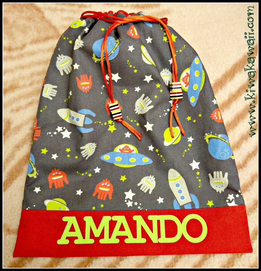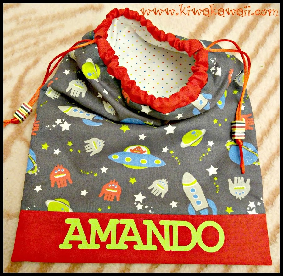 El interior de la bolsita es de una divertida tela de puntitos de colorines. Unas cuentas de rayas decoran las cuerdas.