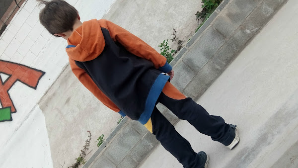 El pantalón no se ve mucho, pero es un pantalón básico con los bolsillos de cada color de plastón con la forma de abajo redondeada. Ninguna complicación. Ya que la sudadera no tiene bolsillos, pues ale el pantalón dos y bien grandes.