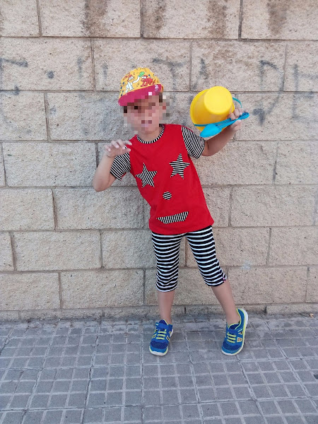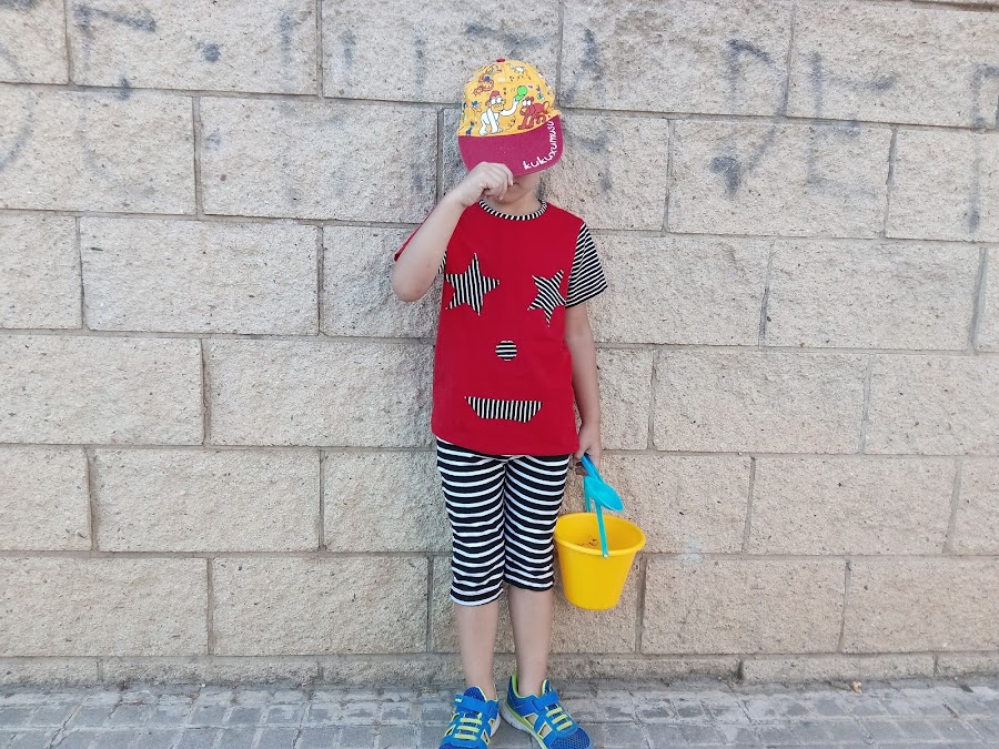 Esta es una camiseta hecha con colaboración del enano, las aplicaciones del delantero son cosa de él, las cortamos, y pegamos con barra de pegamento (truqui fushu fana) y yo las cosí.
