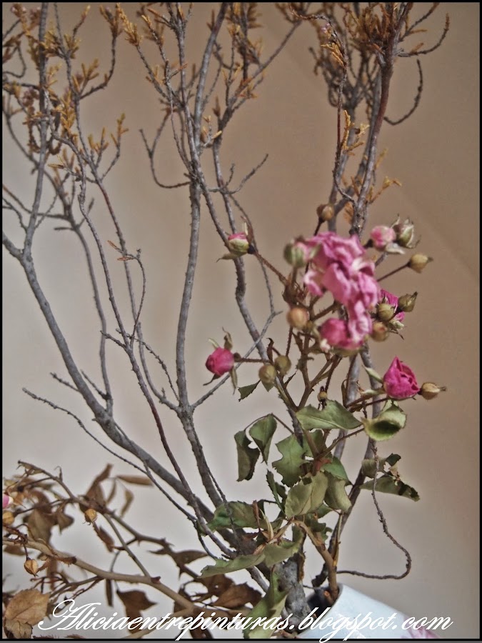 Estas ramas y las rosas enanas me gusta cortarlas, dejarlas secar y ponerlas donde primero se me ocurre.