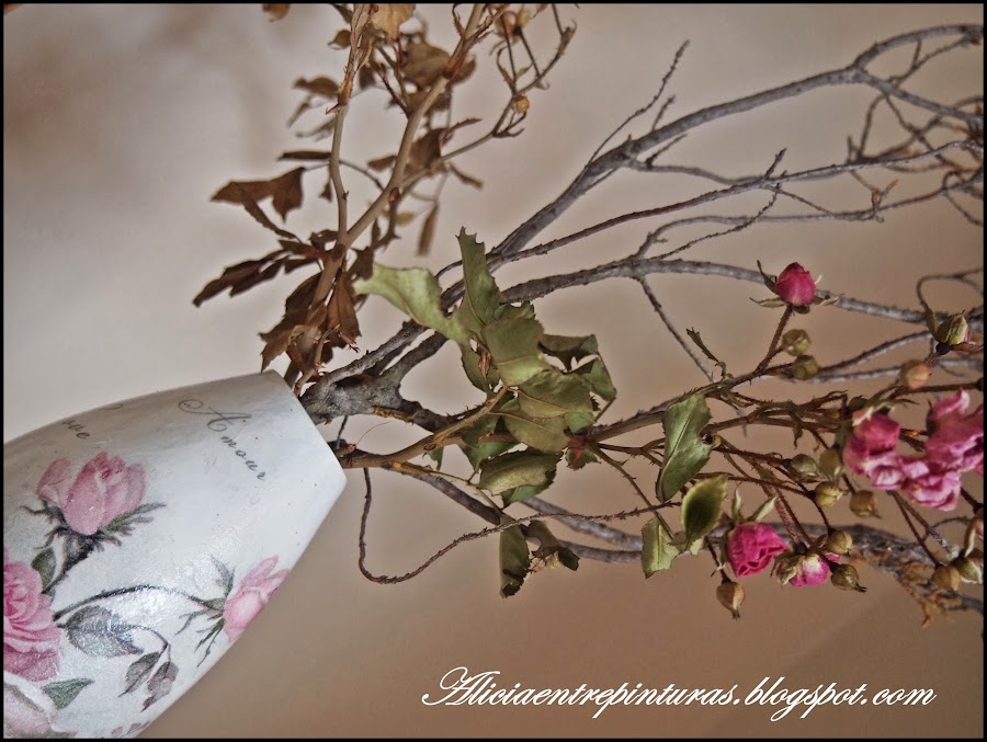 El florero solo pintura blanca y lo acabé con barniz porcelánico. Me apetecía un poco de brillito para que asemejara a la cerámica.