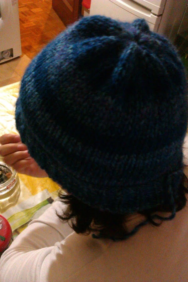Entonces con la ayuda de una aguja lanera pasé la misma hebra de lana con la que estaba tejiendo a través de los 30 puntos que quedaban en la aguja. Una vez hecho esto cosí la costura lateral, pero OJO! No tuve en cuenta que la parte del elástico iba a estar dada la vuelta y al coser la costura por el revés del gorrito ahora se ve... ¡Hubiese sido mucho mejor coser esa pequeña parte de la costura por el lado del derecho!