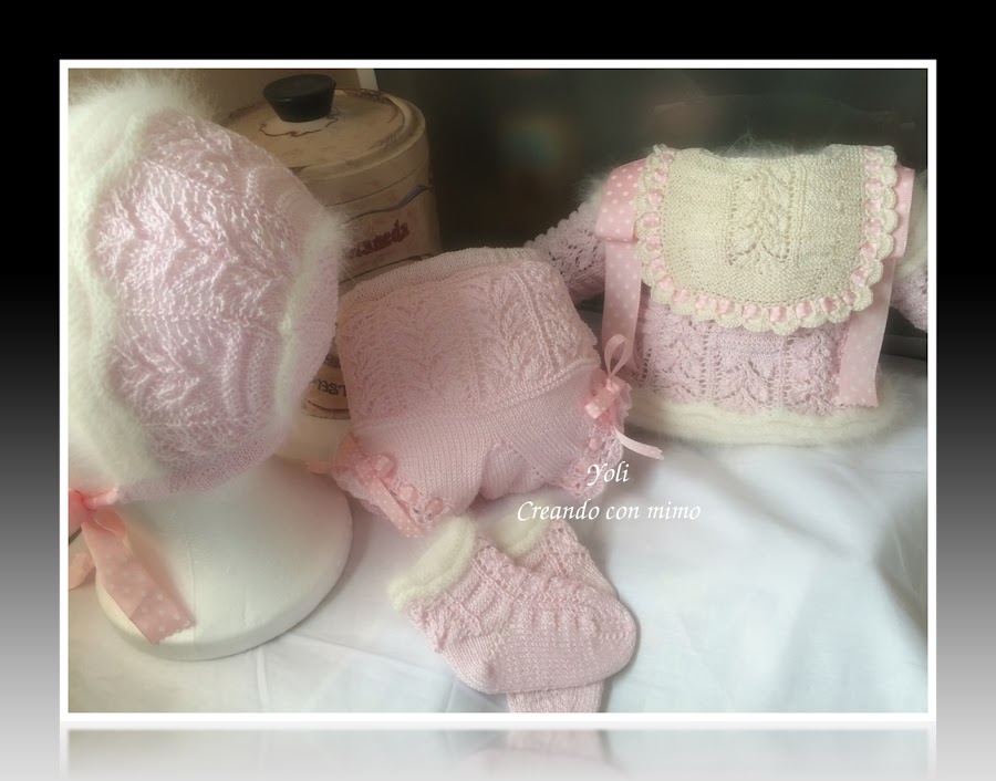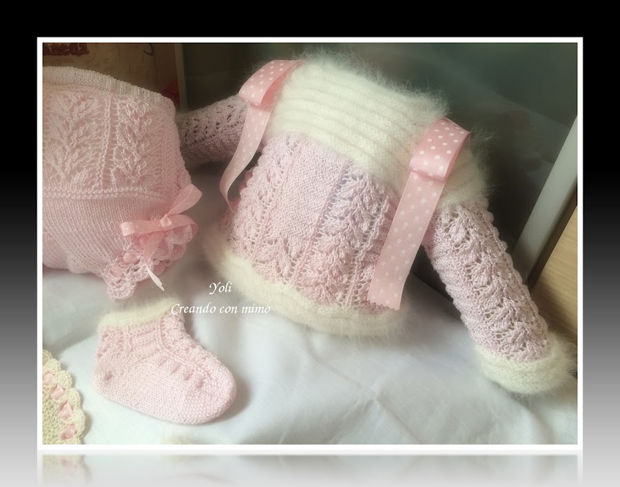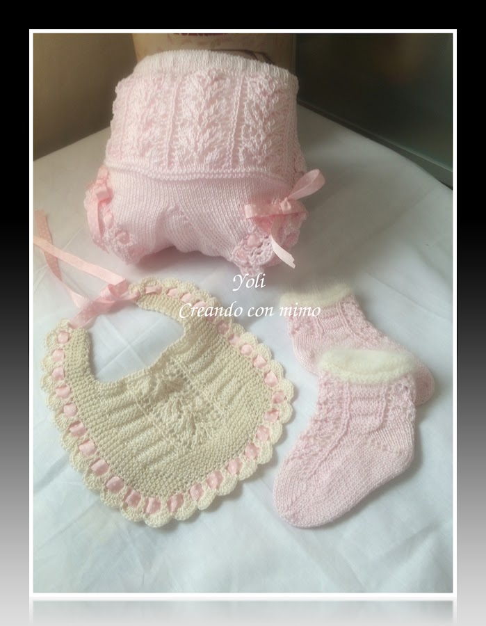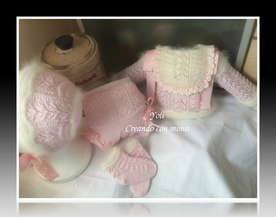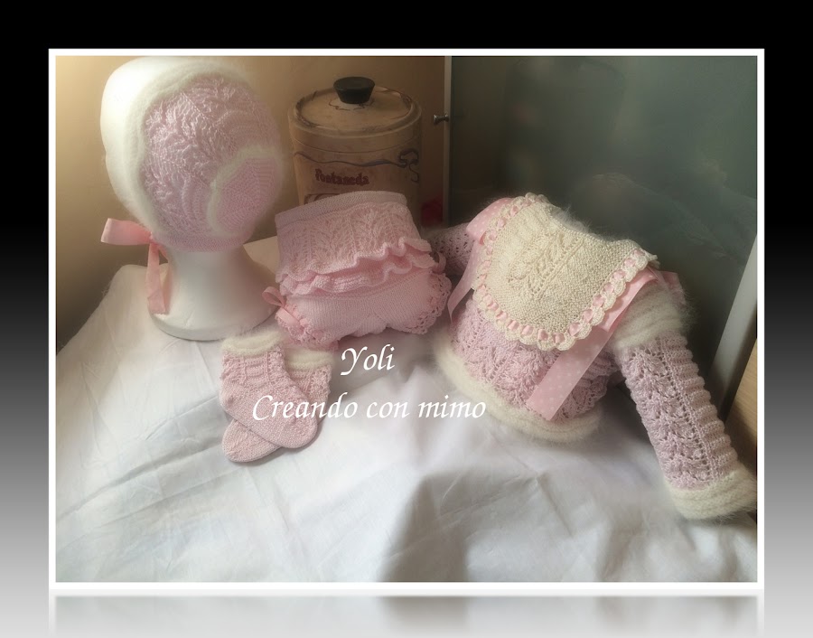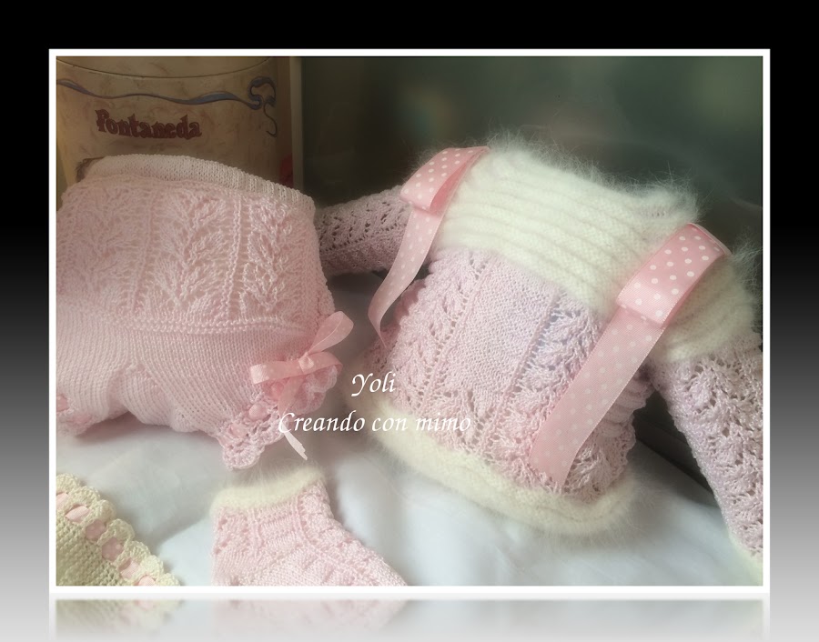 Un conjunto que para mi gusto es delicado, femenino, y especialmente bonito........muy trabajado, y conseguido hacer gracias a mis amigas ROSA MERINO, con su ayuda cosegui el patron perfecto para la chaquetita y calcetines................a pesar de ser un modelo de una antigua revista lleva tal modificacion que casi ha sido como realizarlo a "ojo". gracias a otra gran amiga ROSA BRICIO y a sus estupendos tutoriales fui capaz de realizar la braguita....es tan femenina y bonita...........................Y tambien agradecer a otra de las grandes amigas MARIBI ORAA por su ayuda con el babero.......si pinchais sobre sus nombres podreis admirar sus blogs............soy una afortunada de poder contar siempre incondicionalmente con su ayuda, gracias chicas!!!