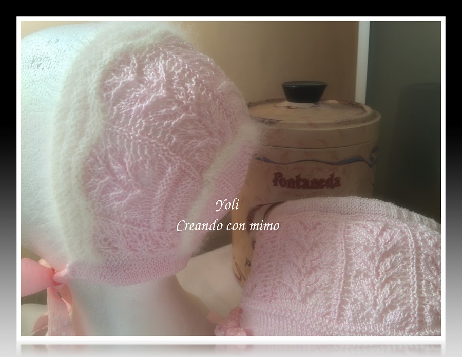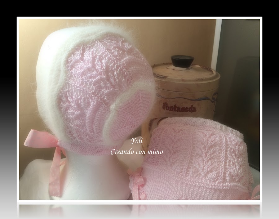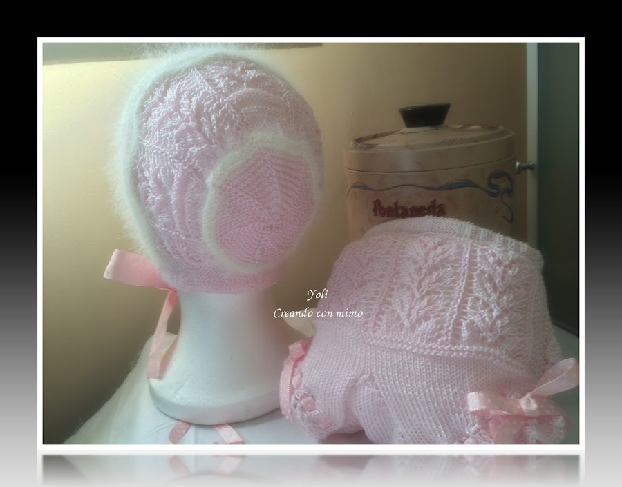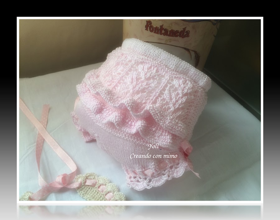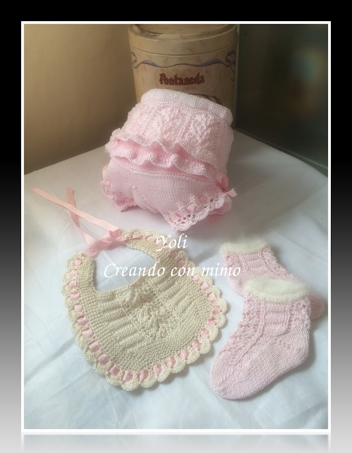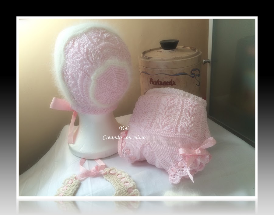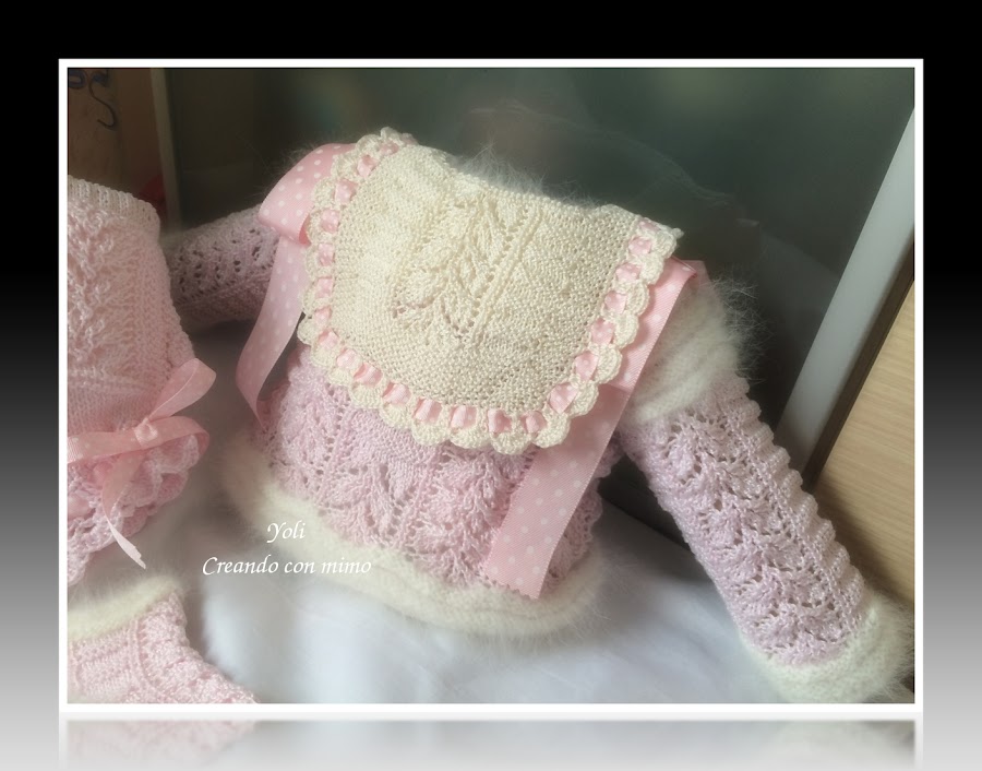 Un conjunto que para mi gusto es delicado, femenino, y especialmente bonito........muy trabajado, y conseguido hacer gracias a mis amigas ROSA MERINO, con su ayuda cosegui el patron perfecto para la chaquetita y calcetines................a pesar de ser un modelo de una antigua revista lleva tal modificacion que casi ha sido como realizarlo a "ojo". gracias a otra gran amiga ROSA BRICIO y a sus estupendos tutoriales fui capaz de realizar la braguita....es tan femenina y bonita...........................Y tambien agradecer a otra de las grandes amigas MARIBI ORAA por su ayuda con el babero.......si pinchais sobre sus nombres podreis admirar sus blogs............soy una afortunada de poder contar siempre incondicionalmente con su ayuda, gracias chicas!!!