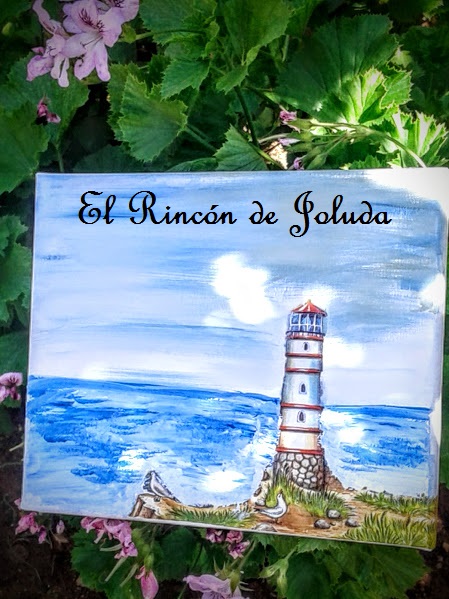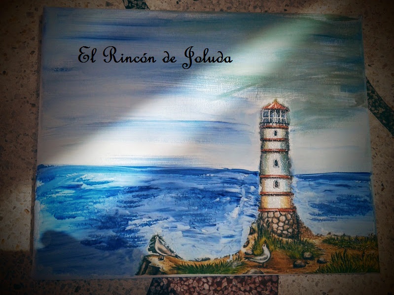 En el cuadro el cielo es pintura acrílica y el mar pasta relieve. El faro servilleta rasgada poco a poco