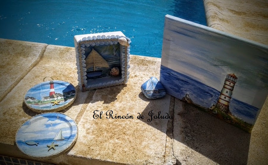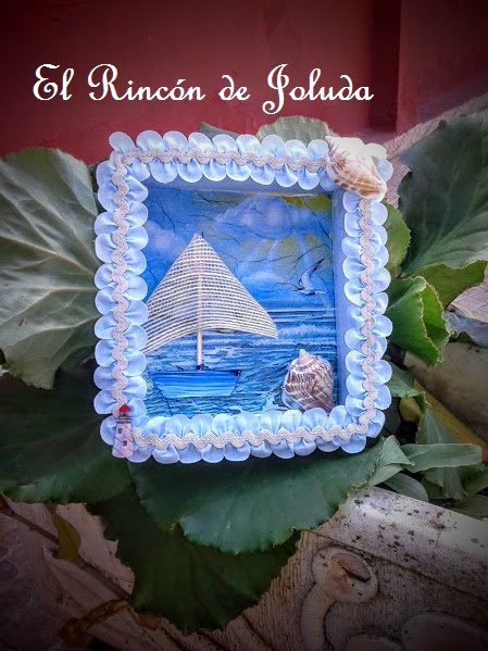 Otro cuadrito más, con el mismo motivo marinero, y un barquito hecho con una pequeña tablita y tela saco, y alrededor una pasamanería que simula las olas y por supuesto unas caracolas recogidas del mar.