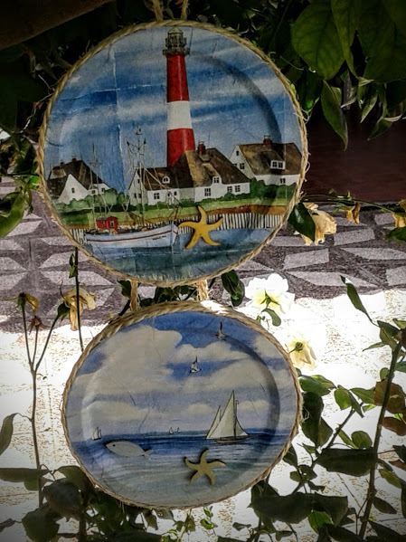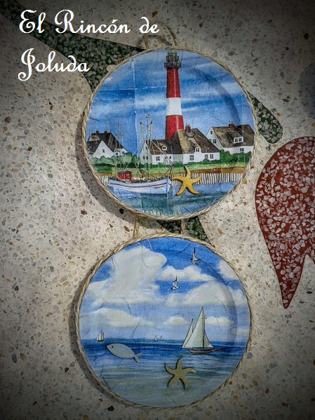Con unos platos de madera, le he realizado un cuadro unidos por cuerda y rematado alrededor de la misma. Con unas servilletas que tenía guardada para una ocasión especial. Y apliques de madera en forma de estrella y pez.