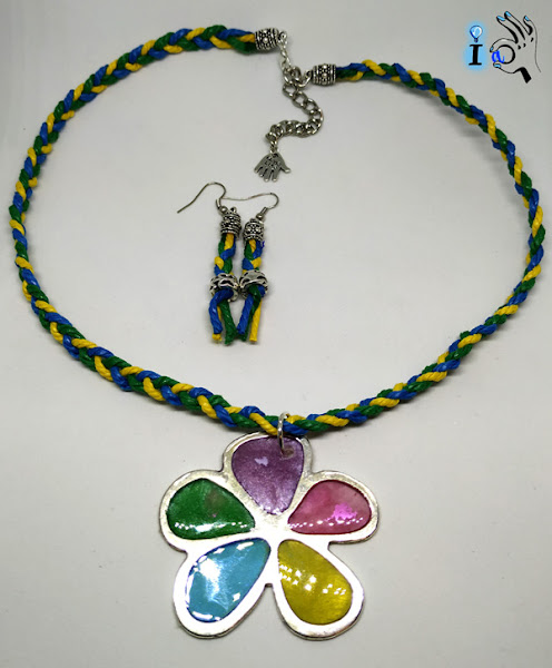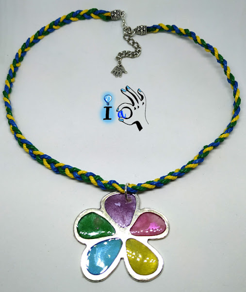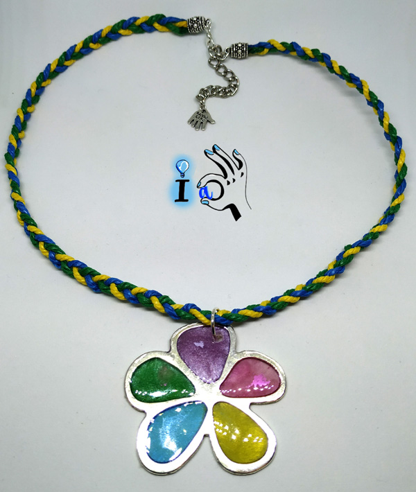 La pieza central es una flor de metal rellena de resina de colores, para llenarla de brillo y los colores del arcoiris. Y para colgarla una cuerda hecha con una trenza amarilla, verde y azul, tres de los colores que tiene la flor.