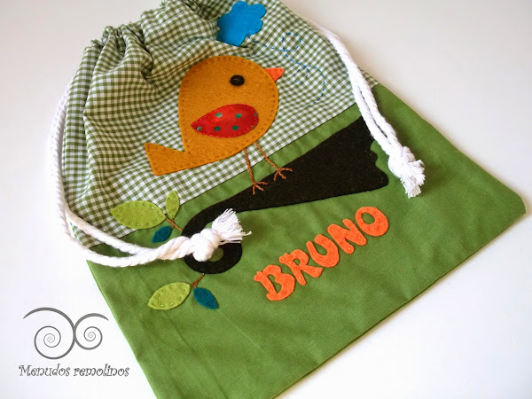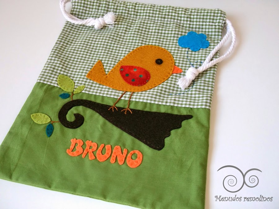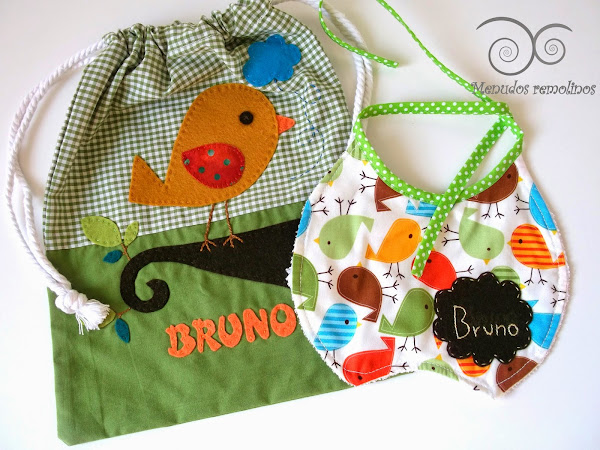 Desde capas de baño, pañaleras, nombres de fieltro, chupeteros, ..., así como baberos,...; pero aún no os había enseñado el conjunto personalizado para Bruno, formado por bolsita para el almuerzo y pechito a juego.