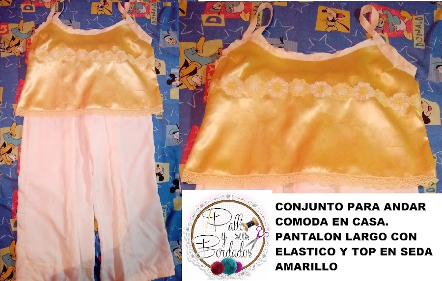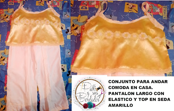 En casa, matando el ocio con la costura. Hoy, conjunto para estar cómoda en casa; pantalón blanco con elástico y encajes. El top en seda amarilla con tiras en cintas blancas, aplique en corte imperio y encaje en la parte inferior.