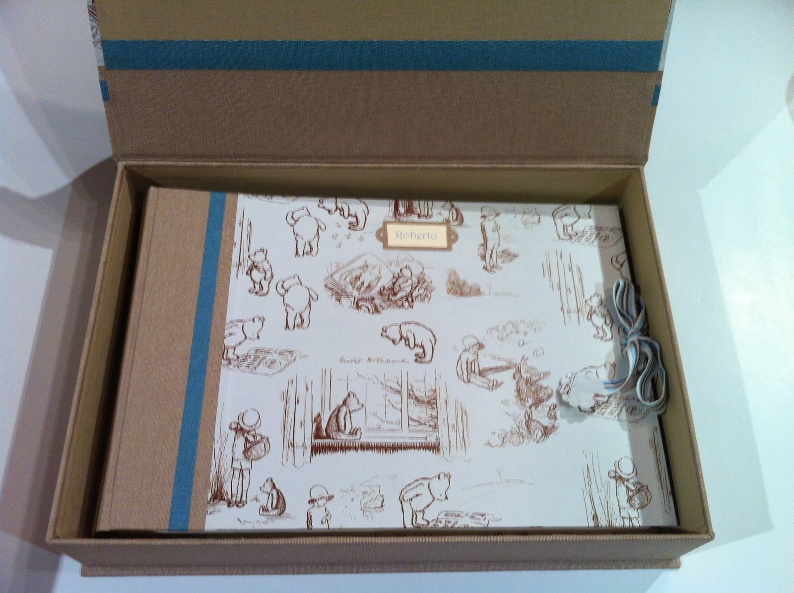 Para el bautizo de Roberto, conjunto de álbum de fotos tradicional y caja a juego todo con tela bukram y papel Winnie de Pooh