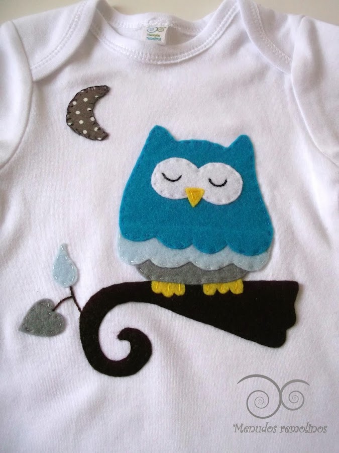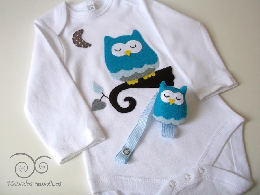 Y me daba algo de penilla que la Búha dormilona, que tantas alegrías me ha dado, estuviese solita, así que aprovechando el encargo que me hicieron para Dani, hice un conjunto coordinado para niño compuesto por body para bebé, chupetero, y nombre de fieltro, (que os enseñaré en otro post), con un diseño del Búho Dormilón.