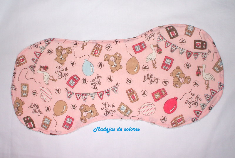 Luego un babero, con la tela rosa y otra cruda, donde bordé su nombre en punto tallo. La trasera de felpa. Como cierre le puse velcro.