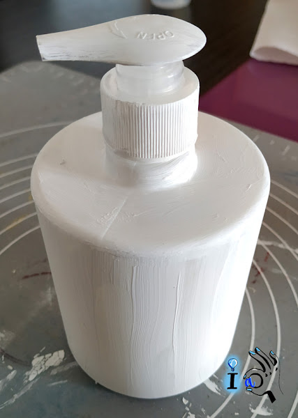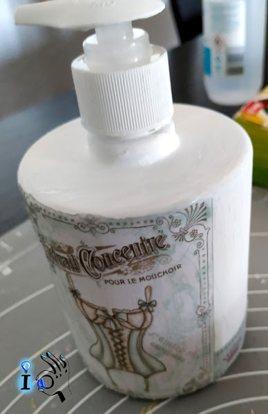 Y como me gustó tanto el resultado decidí hacer lo mismo con el bote de jabón de manos, que coloco normalmente justo en el lado opuesto del lavabo de dónde pensaba poner este bote.