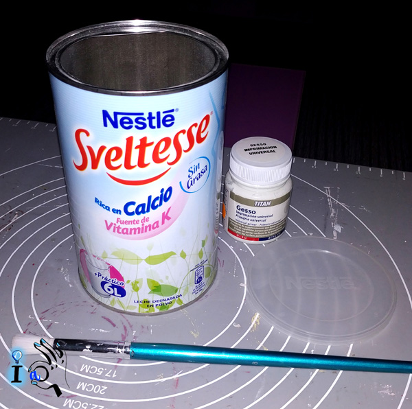 Todo comenzó ante la necesidad que veía de poner una pequeña basurita en el cuarto de baño, sobre todo para tirar la seda dental, porque sin una papelera a mano la seda usada acababa la mayoría de las veces en el vater, y no me gusta hacer eso... De modo que cogi un bote vacío que tenía con tapa y decidi adornarlo. El bote era metálico así que lo primero es darle una imprimación, en mi caso gesso.