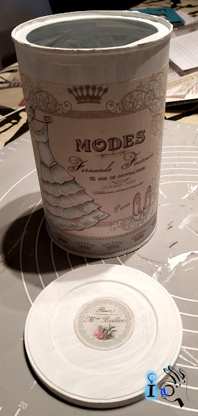 Y luego ya comencé con la decoración propiamente dicha. Tenia unos papeles de arroz con un toque muy vintage que me encantan, así que recorté la zona que me gustaba y una pequeña cenefa que traían e hice decoupage en el bote. También puse un pequeño detalle en la tapa.