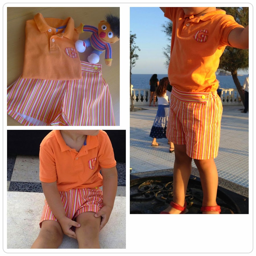 Al polo le puse una aplicación con su inicial, en este caso la tela de la aplicación es la misma que la del pantalón pero he hecho más versiones de la G, ya que le compré dos colores más del mismo modelo de polo.