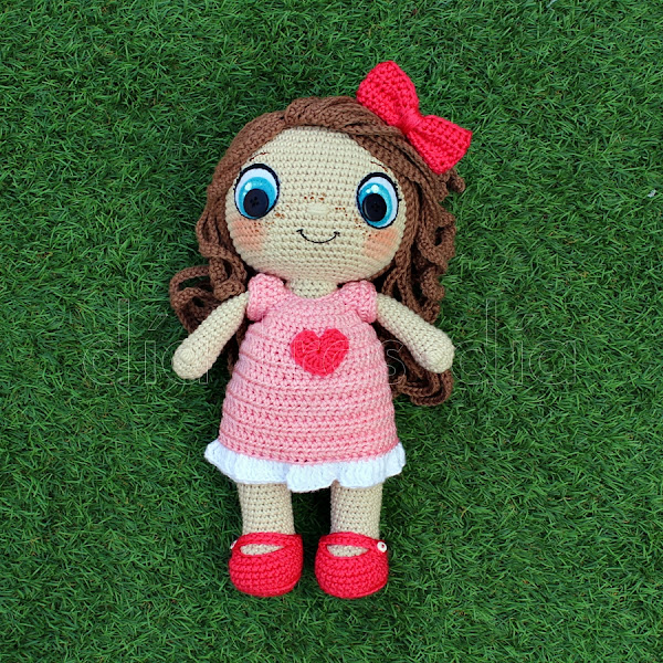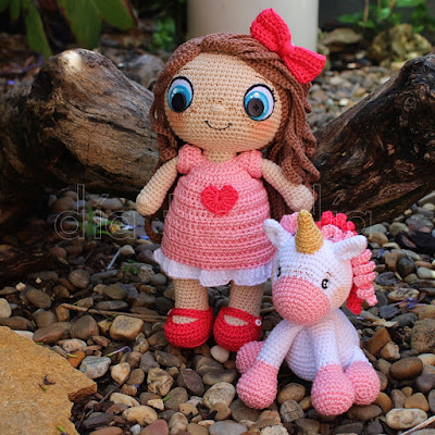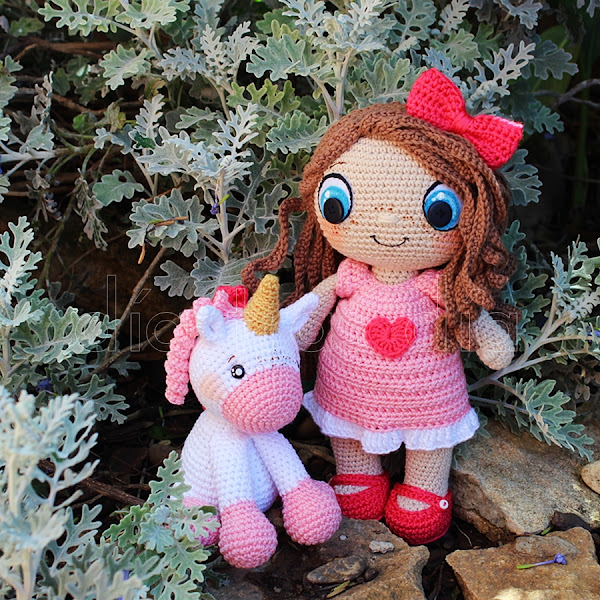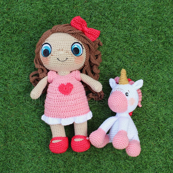Y también preparé estos dos personajesen su versión amigurumi. He de decir que el hacer la muñeca ha sido todo un reto para mí, ya que normalmente los amigurumis que tejo son a partir de patrones de diferentes diseñadores, en los que yo todo lo que hago es seguir las indicaciones del patrón. Pero en esta ocasión me tocó diseñar el patrónsiguiendo el sistema de “prueba-error” para conseguir hacer la muñeca lo más parecida posible a la del dibujo. Os enseño cómo ha quedado, a ver si pensáis que he superado el reto: