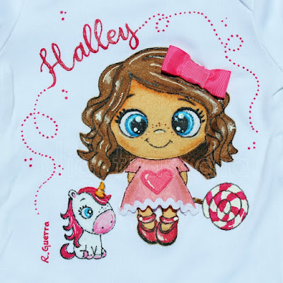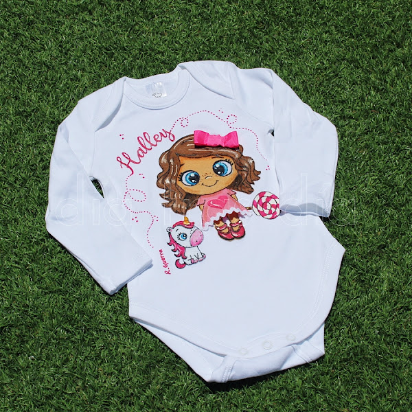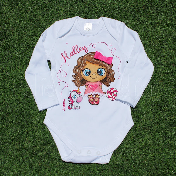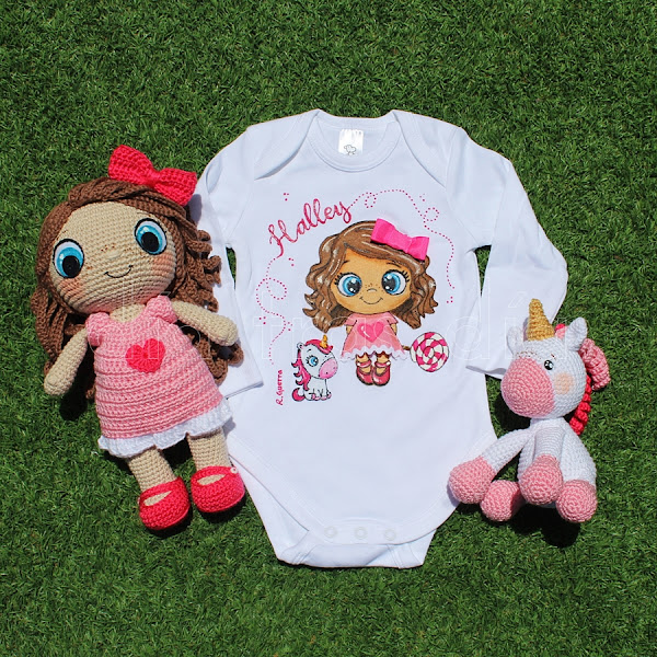 ¿Os ha gustado cómo resultó el conjunto? A Jessic, la mamá de Halley, le encantó y quedó contentísima con el resultado. Cuando lo recibió, aún no había nacido la pequeña, pero algún tiempo después, cuando ya Halley decidió asomarse al mundo, su mami me envió una foto de la peque con su body y sus muñequitos y os digo que estaba para comérsela.