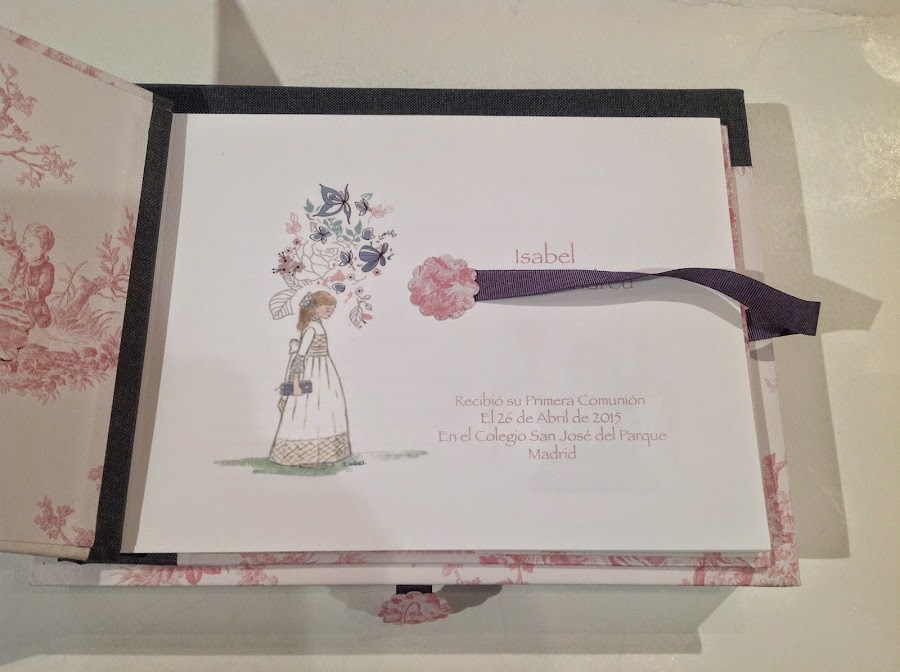 Próximamente mi sobrina celebrará su Primera Comunión. Ya os he comentado que entre su madre y yo estamos haciendo los regalitos para los invitados y ya habéis visto lo que yo he hecho. Ahora le toca el turno al recordatorio del evento. Me permitiréis que haya borrado la cara de la niña. No quiero que se haga famosa tan temprano, jeje, pero sí quiero enseñaos cómo ha quedado el conjunto. Éste es ...