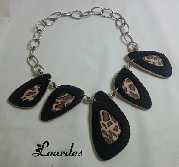 Este conjunto de collar y pendientes está realizado con esta composición de rectángulos en colores gris, naranja, negro y nácar. La masa va horneada con piezas metálicas He completado el conjunto con piezas onduladas en alambre plano negro