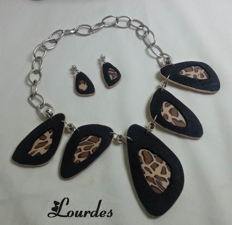 Este conjunto de collar y pendientes está realizado con esta composición de rectángulos en colores gris, naranja, negro y nácar. La masa va horneada con piezas metálicas He completado el conjunto con alambre plateado grueso