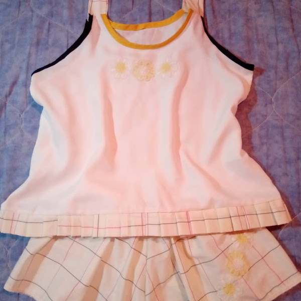 2. Tela en satén blanco ostra, con tiras y faralado en tela escocesa con sesgo en las sisas de las mangas, short en tela escocesa con encaje y aplique igual que el top.