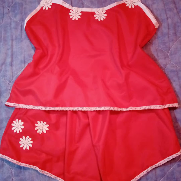 1. Tela de raso rojo, top con tiras en sesgo blanco y short con encaje y aplique como en el top.