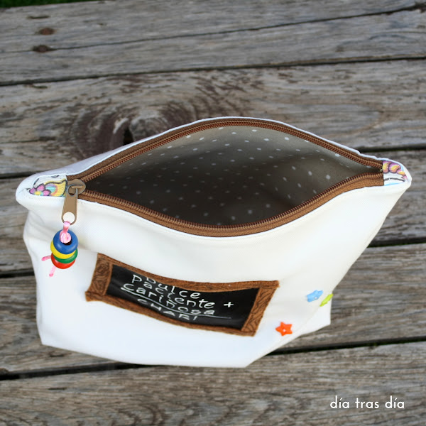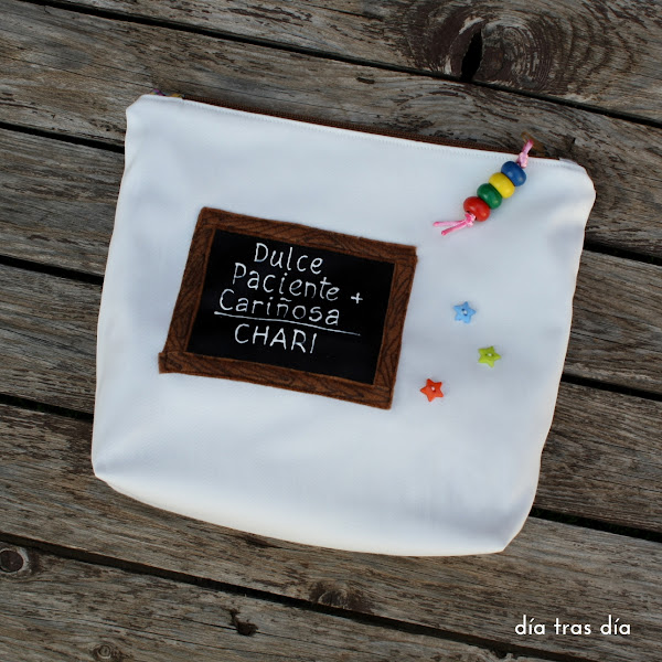 Este es el bolsito, decorado en la parte delantera con la misma pizarra que la bolsa y con los nombres de los peques en la parte trasera:
