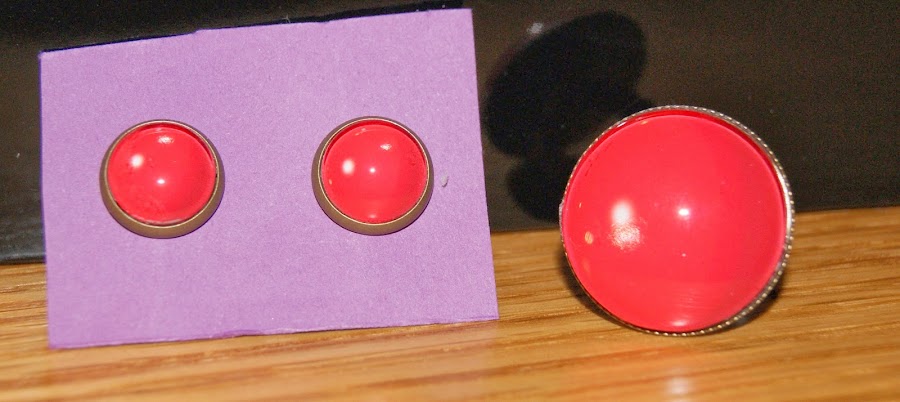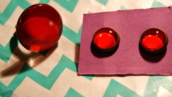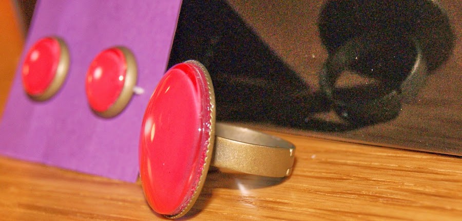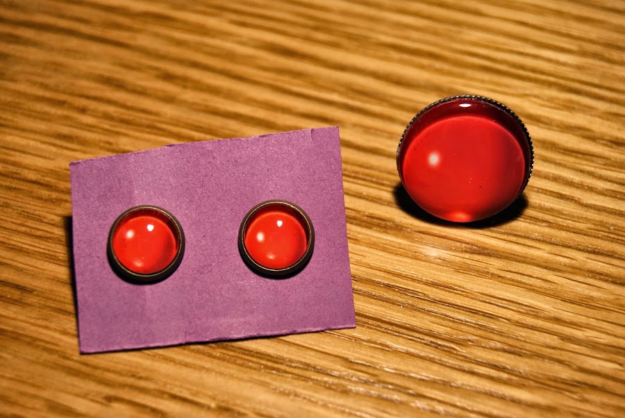 Lo pendietes y el anillo son sencillitos, de color rojo, pero con un toque divertido: ese puntito blanco que refleja en el cristal. Espero que se pueda apreciar bien en las fotos. En algunas salen algo anaranjados pero es un rojo vivo. Las bases son en color bronce.