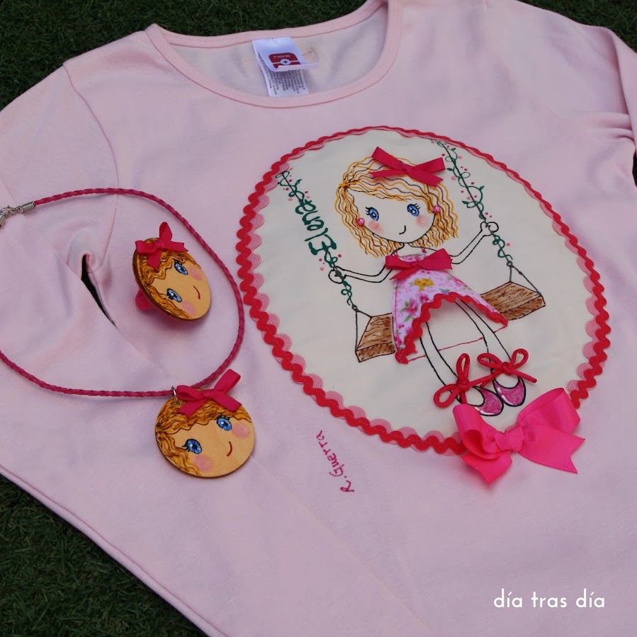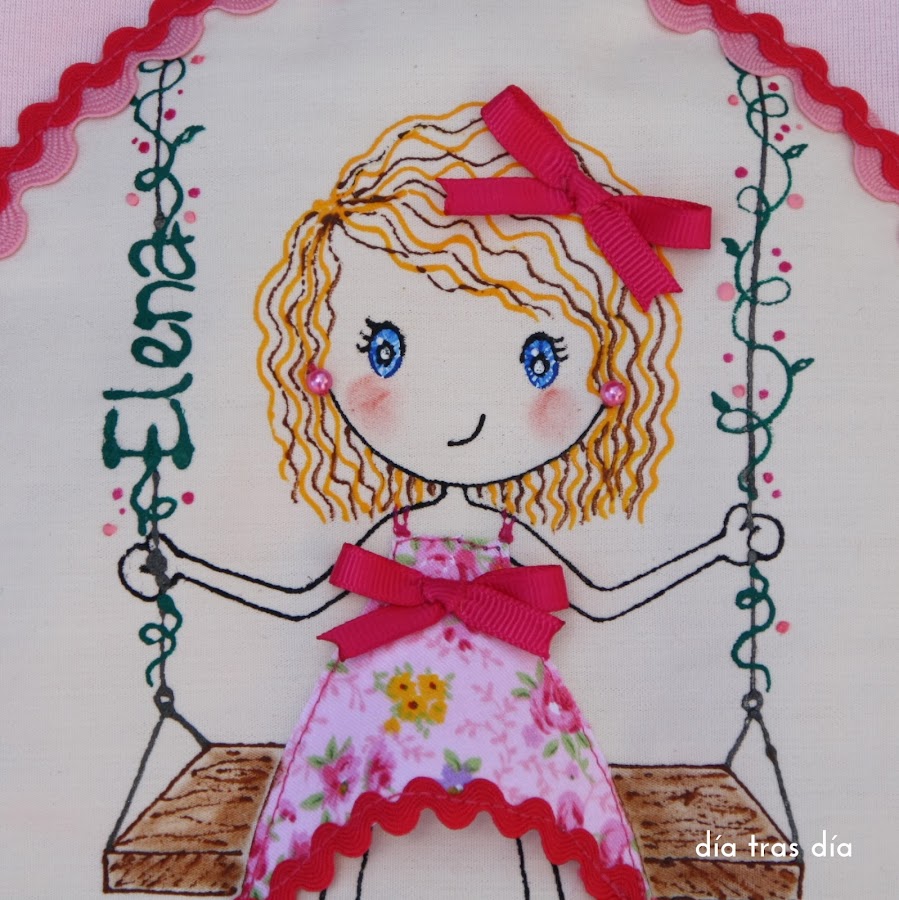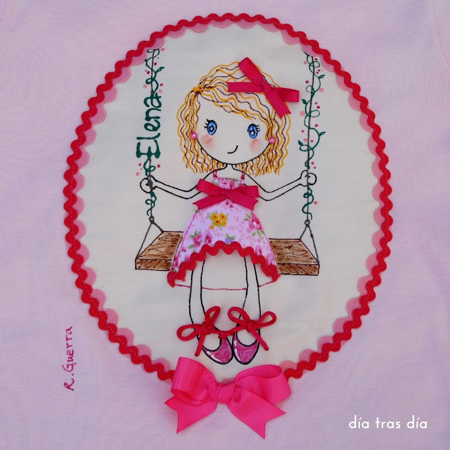 Además, como sabéis que me gusta hacer las camisetas cuanto más personalizadas mejor, no sólo le incluí el nombre de su destinataria, sino que también la caractericé con el color y forma de pelo y color de ojos de Elena.