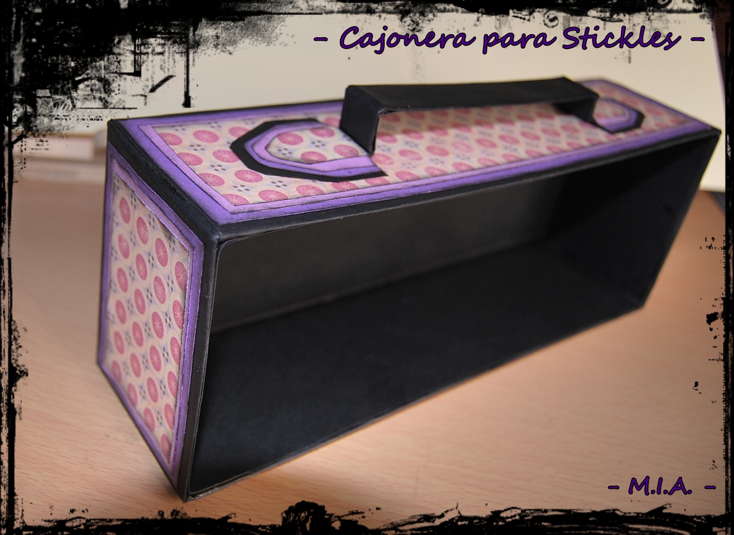 Todo está hecho con base de cartón de cereales, forrado con cartulina negra de base y dos tonos de lila que hacía juego con el papel del Tacopapeles.