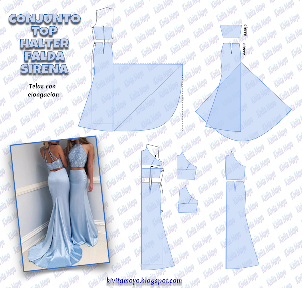 Usar telas con elongacion. Trazar un top por encima de la cintura, con escote halter. Descontar 2 cm en laterales. En el trasero suprimir la pinza de entalle en el centro del patron. En el delantero ignorar la pinza de busto e incorporar una pinza de 1 cm en la sisa para evitar que desboque. Cerrar la misma y trasladarla al centro del patron. Estas partes se cortaran dobles como forreria. Entre medio de las misma se incoporaran los tirantes. Terminar con cierre desmontable cubierto cn tapeta.