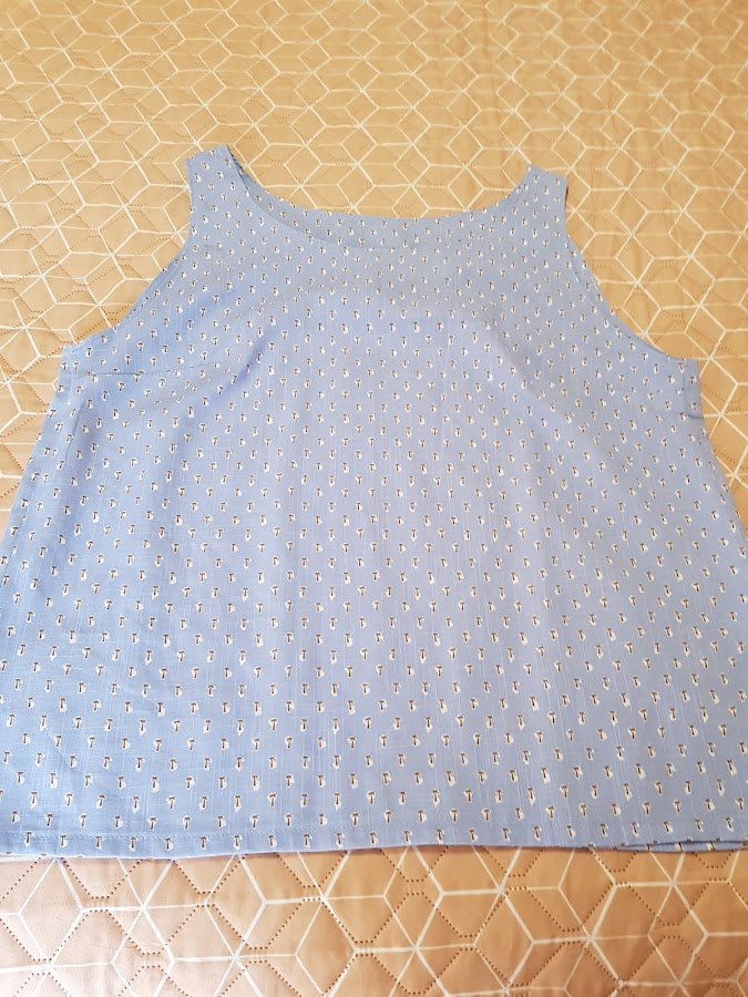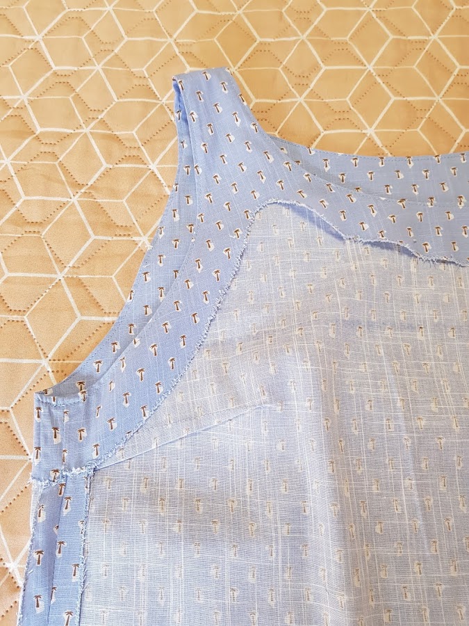 Las vistas las corte todas juntas cuello y sisas a las vez en la misma tela del top y la verdad es que asi queda mas pulido todo el escote y las sisas , en las fotos podeis ver como queda el derecho y el reves de las sisas y el cuello ademas del estampado del tejido .