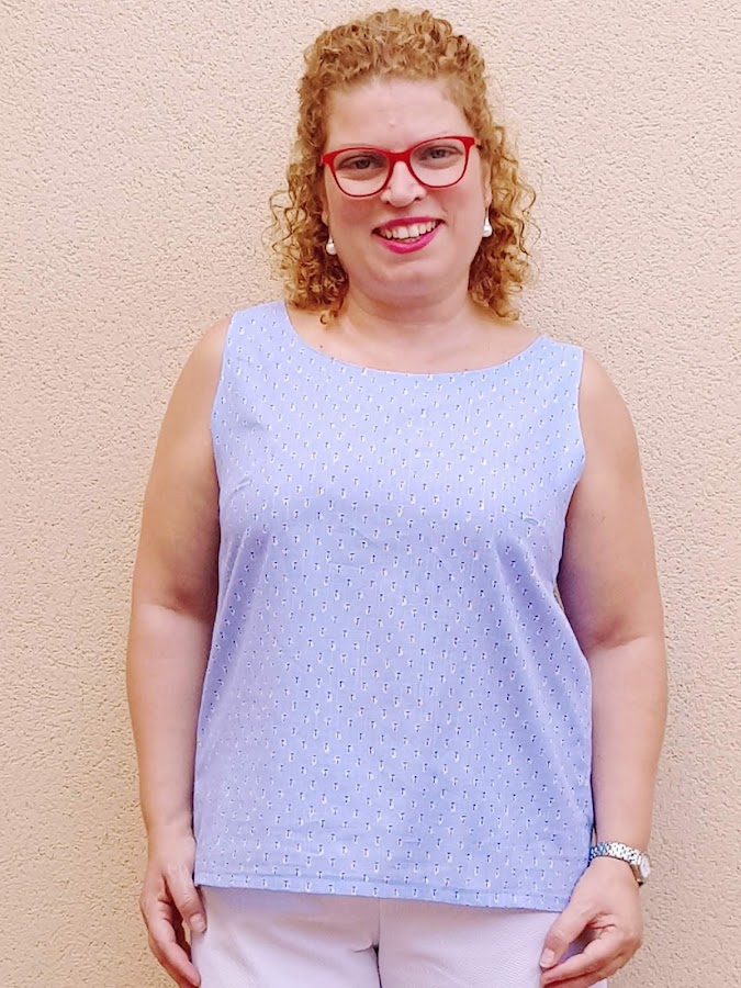 El tejido del top es una mezcla entre lino y algodon de color azul cielo con dibujos de palmeritas muy pequeñitas ni que decir tiene que el twejido es muy fresquito para la calor del verano .
