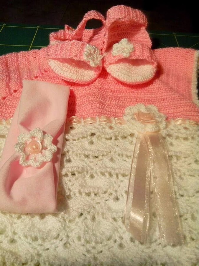 Y en vez del gorrito lo complementé con una felpita muy ponible con otros vestidos rosas y unas sandalias también en rosa y blanco. El resultado me gustó mucho a mi y a la mamá de Abril también así que decidí ponerlo a la venta. Bueno este no, evidentemente, hago conjuntos nuevos.