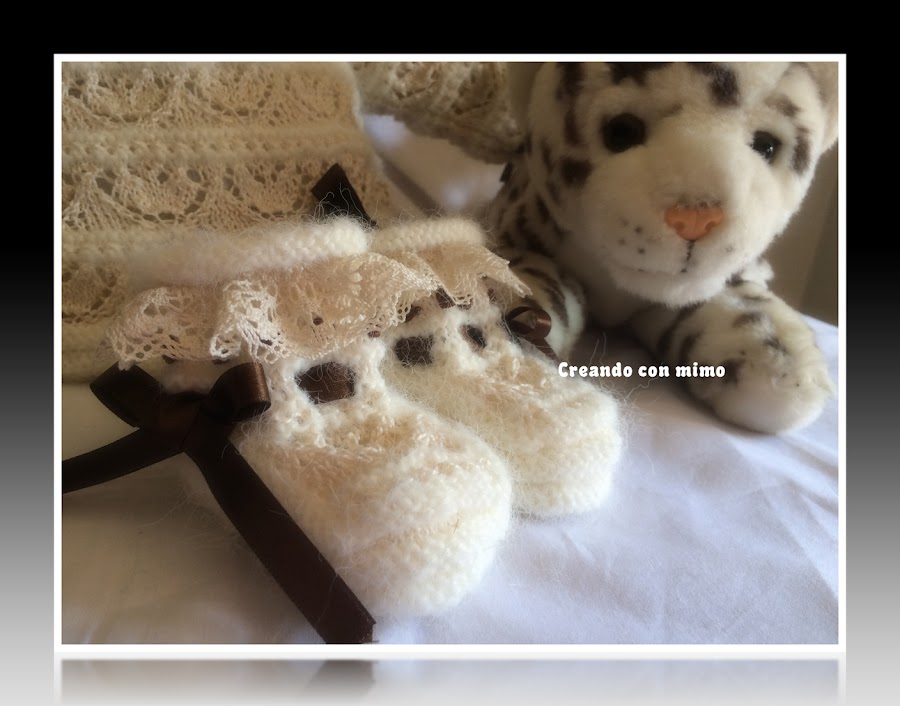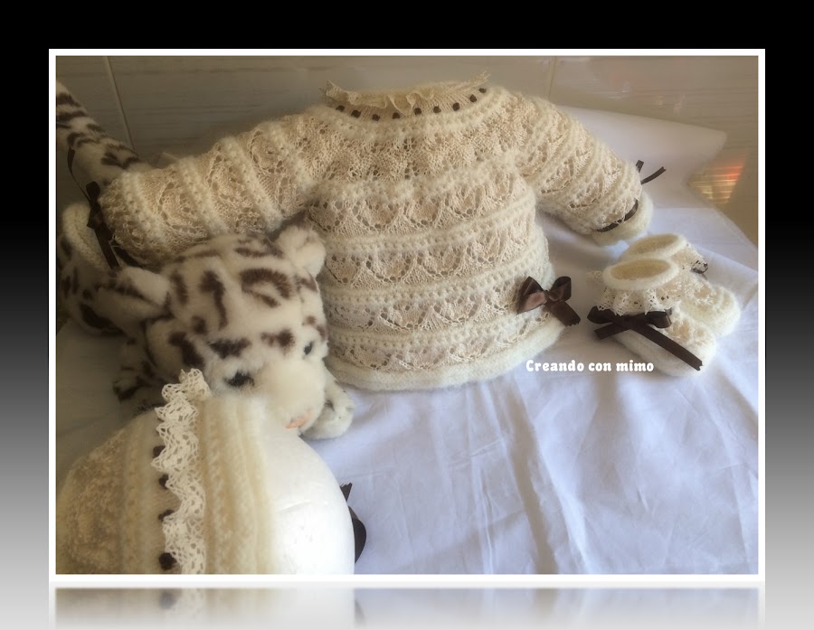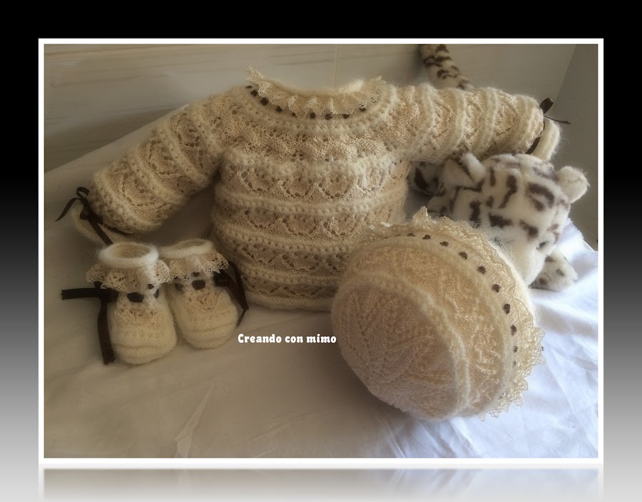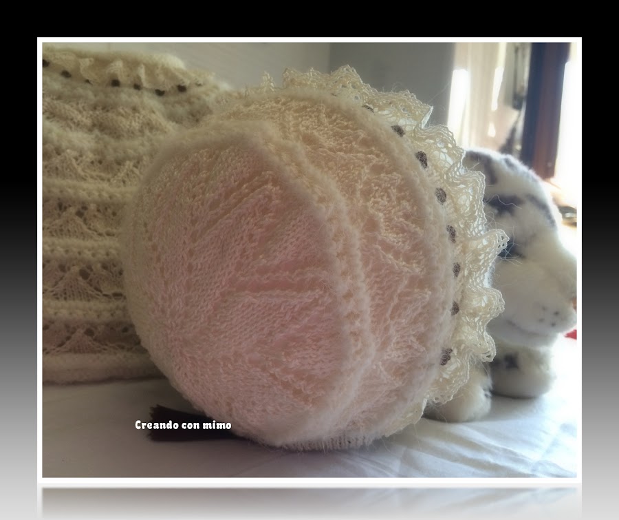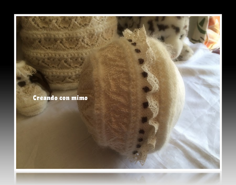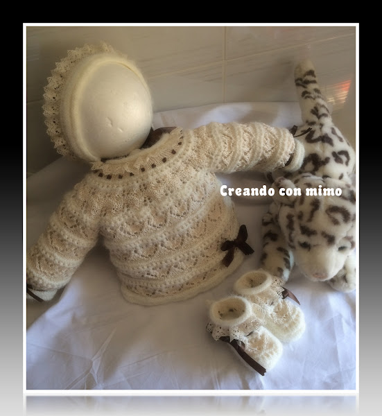 Pues lo dicho, yo lo teji en perle egipcio color nata, y nylgorina a tono.........y para darle mi toque personal ,ademas de adornarlo con las puntillas de bolillo del original que le dan ese aire tan bebe lencero, le di mi toque de color con los lazos de raso y las florecillas rococos en tono marron chocolate....una combinacion perfecta, moderna y dulce........lleva muchas, muchas florecillas jajaja asi que si os animais a hacerlo paciencia ajjajaja