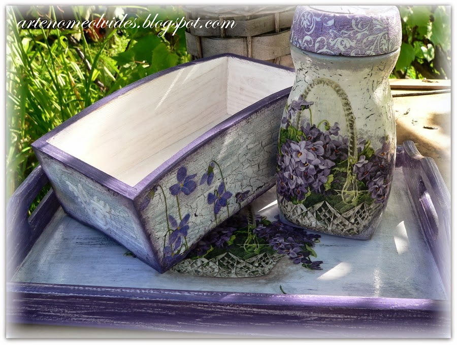 Hoy os presento un conjunto de violetas. El tarro hize ya hace meses, el resto este verano.