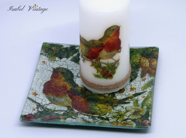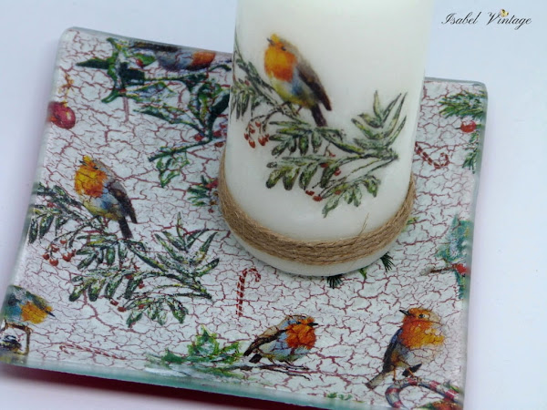 Os quiero enseñar un detalle que puede resultar perfecto para regalar en estas fechas: un conjunto de plato de cristal y vela decorados con decoupage.