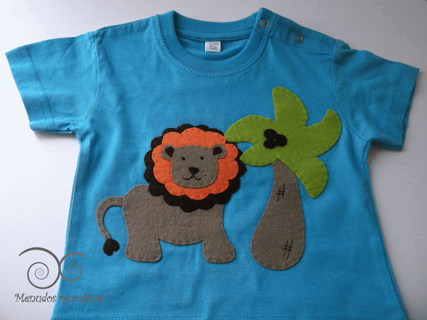 La idea era que la camiseta y el body estuviesen combinados con chupeteros a juego. Gloria se decidió por el diseño del elefante y el ratón, y por un león de fieltro para la camiseta azul