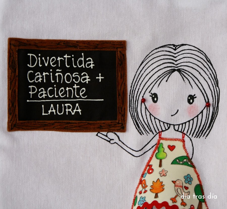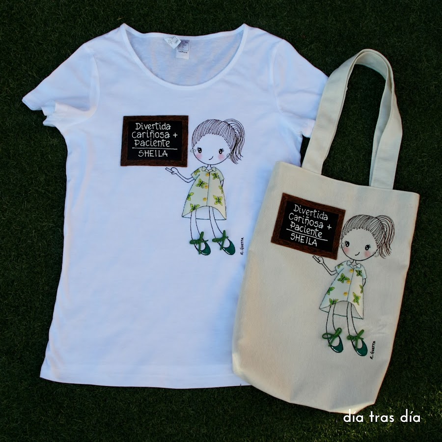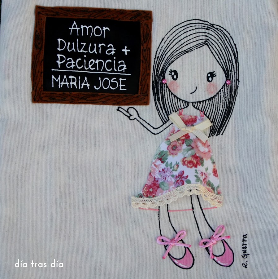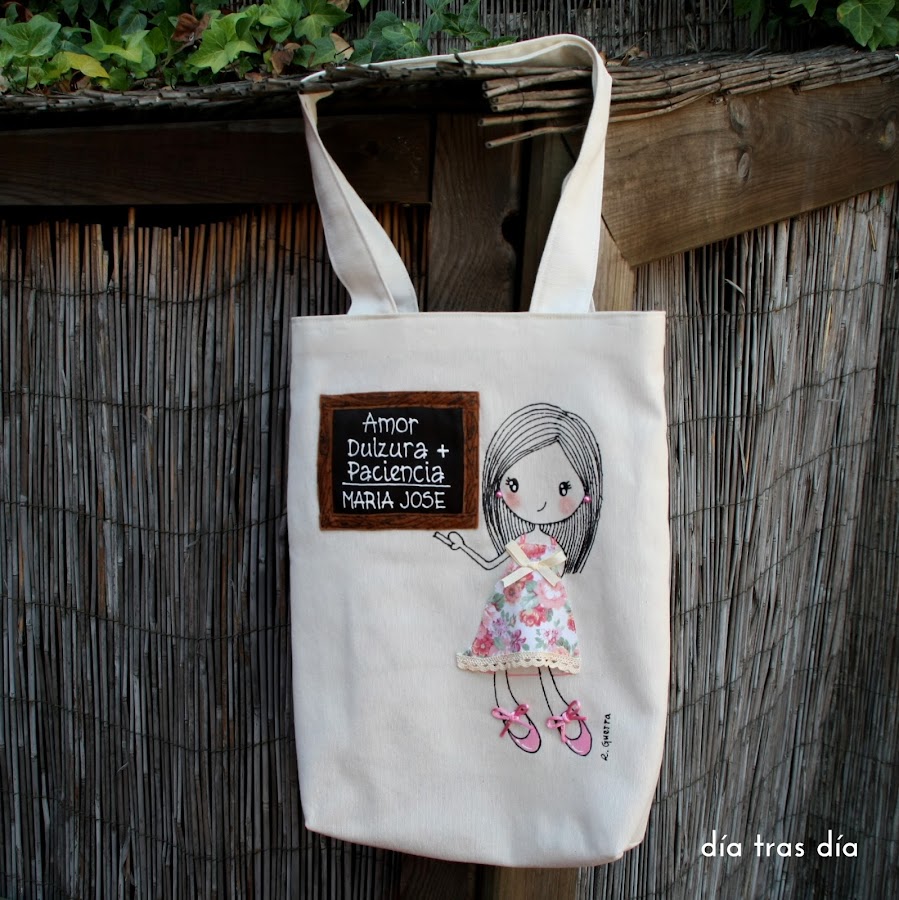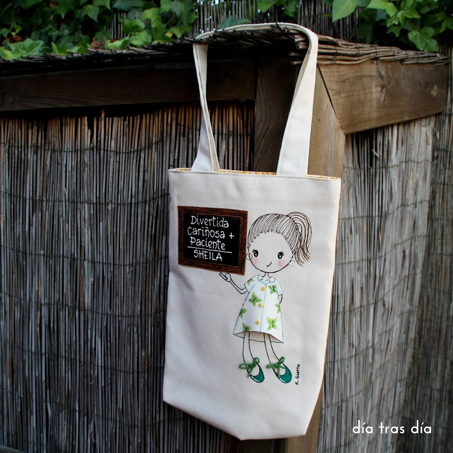 Voy a empezar con el conjunto que me pidió Sandrapara regalar a la seño Laura. Sandra vio uno de los bolsos que hice con Ro-ro maestra como protagonista, con el vestido decorado con dibujos infantiles, y me pidió que fuese tal cual. Así que repetí modelo tanto en bolso como en camiseta. Aquí podéis ver el bolso que me encargó Carmen para la seño Cristina y que fue el que le gustó a Sandra.