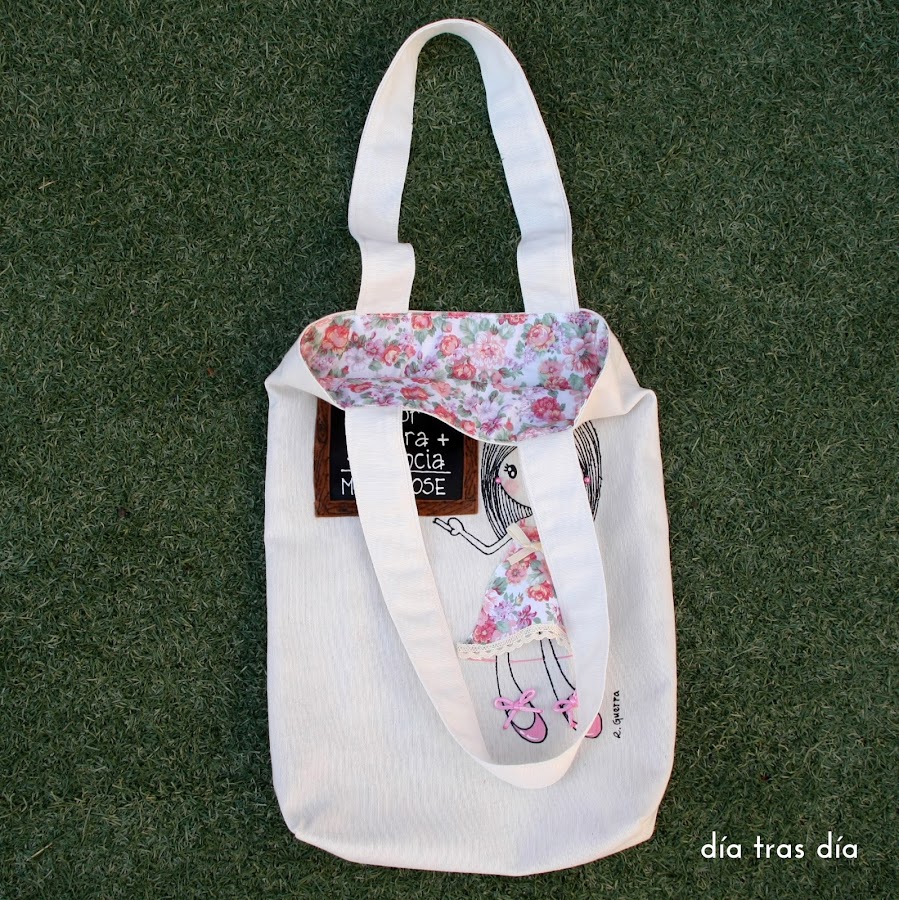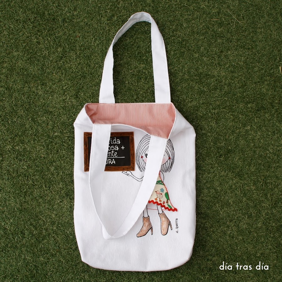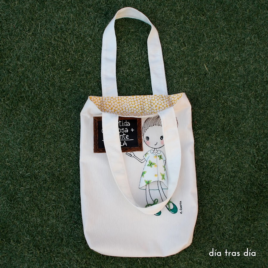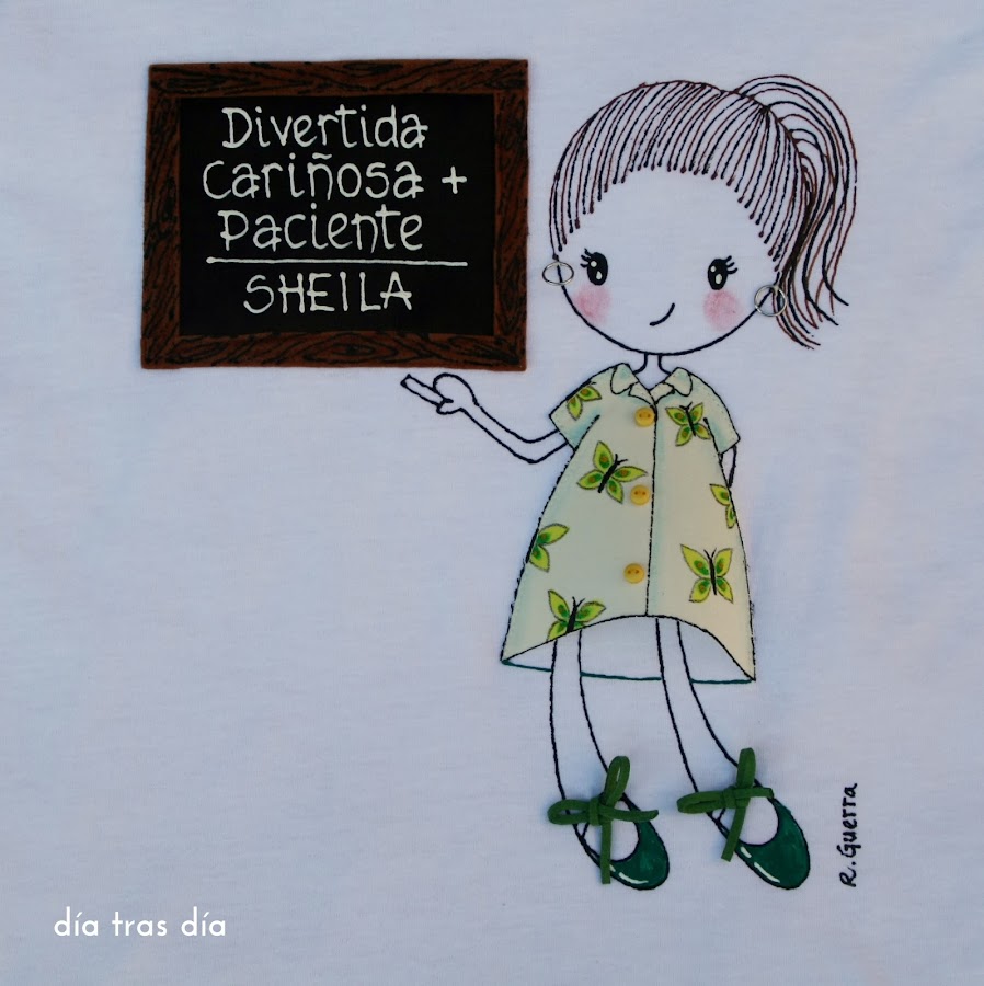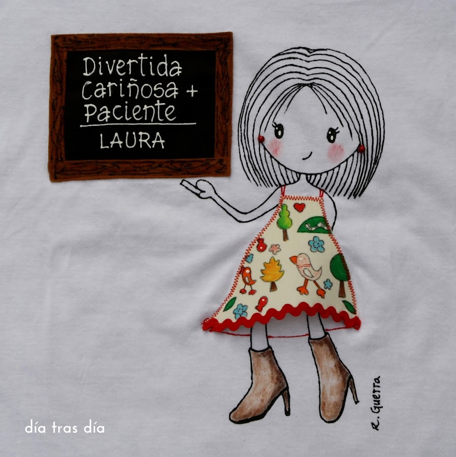 Voy a empezar con el conjunto que me pidió Sandrapara regalar a la seño Laura. Sandra vio uno de los bolsos que hice con Ro-ro maestra como protagonista, con el vestido decorado con dibujos infantiles, y me pidió que fuese tal cual. Así que repetí modelo tanto en bolso como en camiseta. Aquí podéis ver el bolso que me encargó Carmen para la seño Cristina y que fue el que le gustó a Sandra.