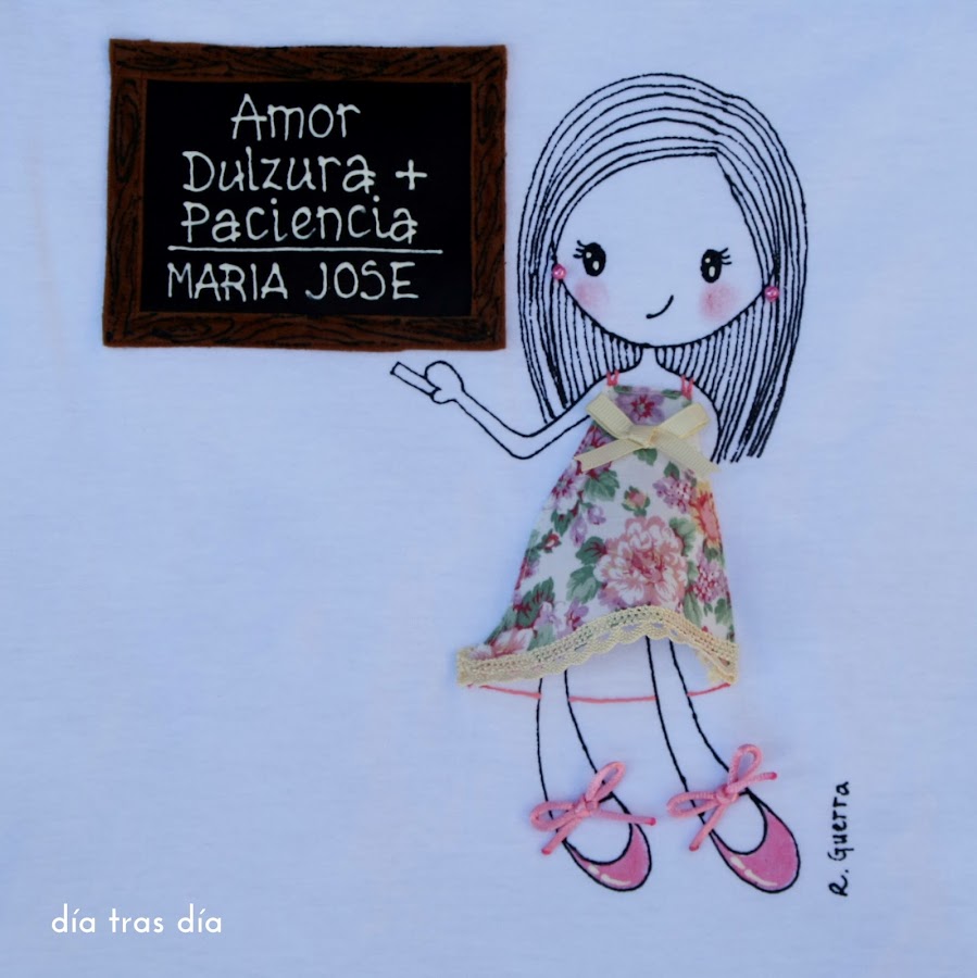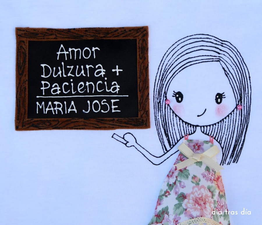 Y por último, este otro conjunto fue el que me encargó Rosario para regalar a la seño Maria José. Al igual que Tamara, Rosario me envió algunas fotos de la seño para que intentase sacar sus rasgos principales. El vestido me lo dejó a mi elección, pero como me comentó que la seño es muy dulce, opté por hacerlo con una tela de estampado suave y coqueto.