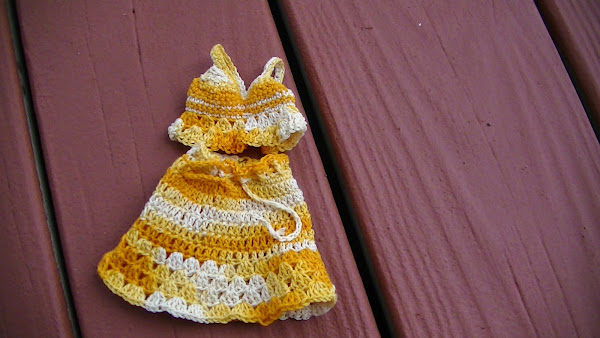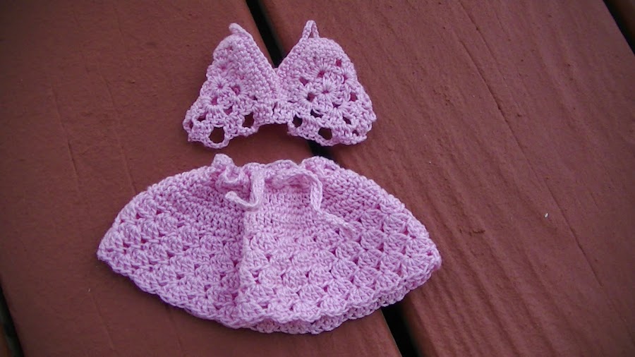 Como tengo tres hijas, y a veces juegan con las muñecas, a ellas les encanta cambiarles la ropa, asi que cada tanto les tejo algun conjunto nuevo para las muñecas, asi tienen mas variedad. Son muy faciles de tejer, en este caso use hilo macrame del mas fino y una aguja crochet de 1.5 mm. quedan muy delicados, y a las nenas les encanta.