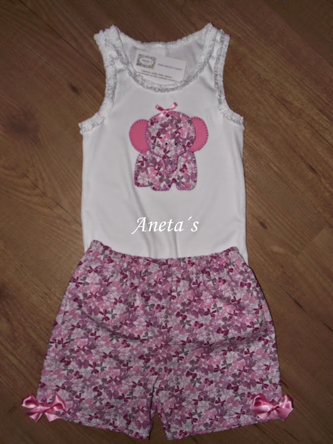 La camiseta esta decorada con un elefante de tela y estan cosidas a mano, a juego con un pantaloncito hecho también a mano.