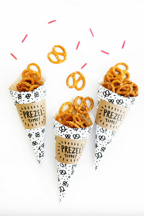 Los conos de papel son facilisimos de hacer, solo imprimir la plantilla, doblar y rellenar del apertivo que más os guste (en este caso son mini-pretzels, pero le podrías meter patatas fritas, galletitas saladas, tacos de queso o jamón etc...).
