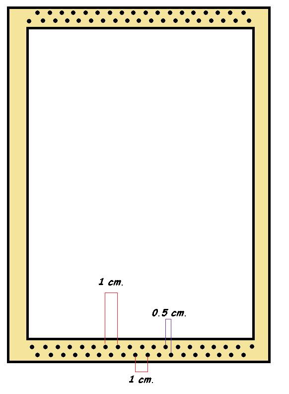 Tanto en la hilera superior como en la inferior, la separación entre los clavos, será de 1 cm. y al colocarlos como nos muestra el diagrama, conseguiremos que la separación entre los hilos de la urdimbre sea de sólo 0.5 cm.