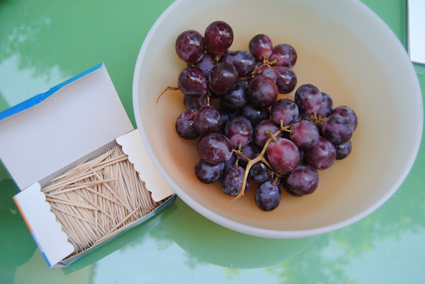 Se necesita simplemente un buen montón de frutas redondas, (ideal si son de temporada, como arándanos, frambuesas, cerezas, o simplemente trozos de sandía o de melón) y palillos de mesa.
